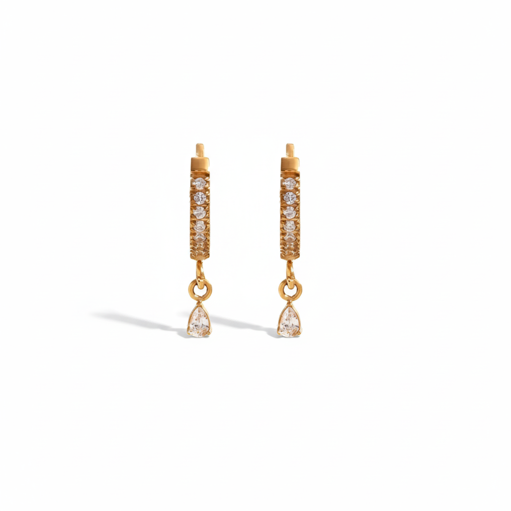 Embrace understated elegance with these dainty crystal and gold tiny teardrop-shaped dangling hoops. Each earring features a delicate gold hoop adorned with a small, shimmering crystal teardrop that catches the light beautifully. The minimalist design makes these earrings a versatile addition to any jewelry collection, adding a subtle touch of sparkle to your everyday look.