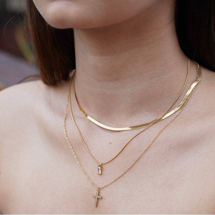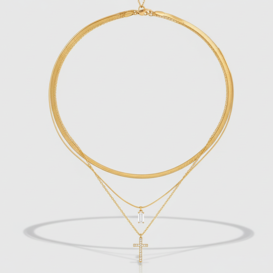 A radiant ensemble of delicately layered gold chains, each crowned with shimmering pendants that symbolize light, faith, and hope. This stunning piece embodies beauty, serenity, and grace, making it a timeless accessory for both meaningful occasions and everyday elegance.