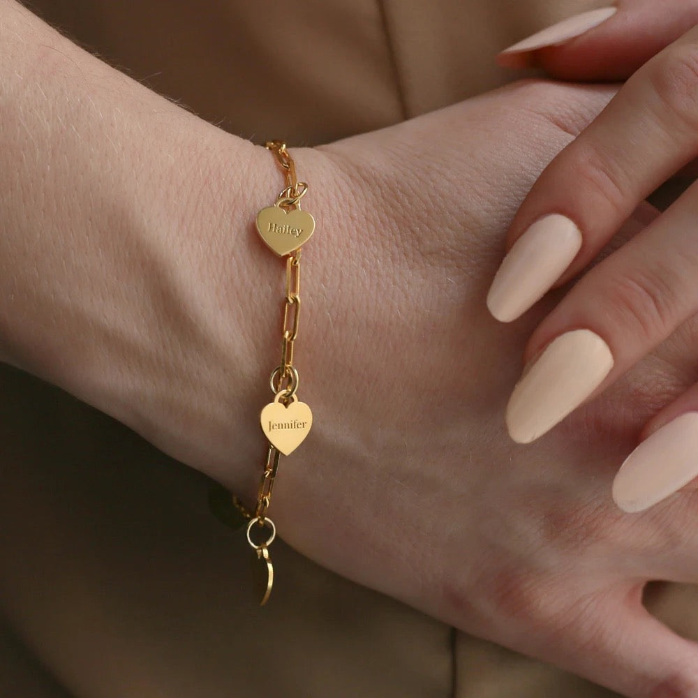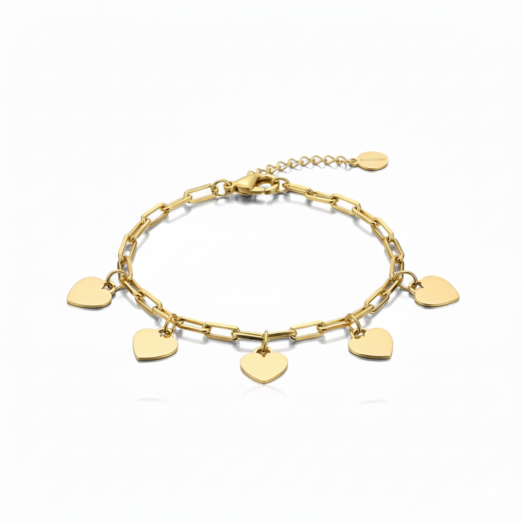 Showcase your special bond with this 18k gold plated bracelet featuring five engraved heart charms. A beautiful gift for loved ones, with an anti-tarnish finish for long-lasting charm